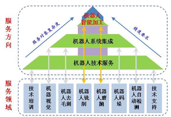 機器人應用技術中心依托華中科技大學數字制造裝備與技術國家重點實驗室、上海交通大學機器人研究所等科研機構,跟蹤國際先進機器人技術研究成果,開展航空、航天、汽車、新能源、光伏領域的機器人應用技術研究,開發出的飛機蒙皮銑削加工機器人、大行程非接觸測量機器人、視覺導引機器人在國內外處于領先地位,可以為航空、航天、汽車、新能源等高端制造企業提供機器人加工系統總體解決方案和機器人智能加工裝備,提供機器人加工、機器視覺檢測、機器人標定、大行程非接觸式測量等機器人應用技術研發與服務。