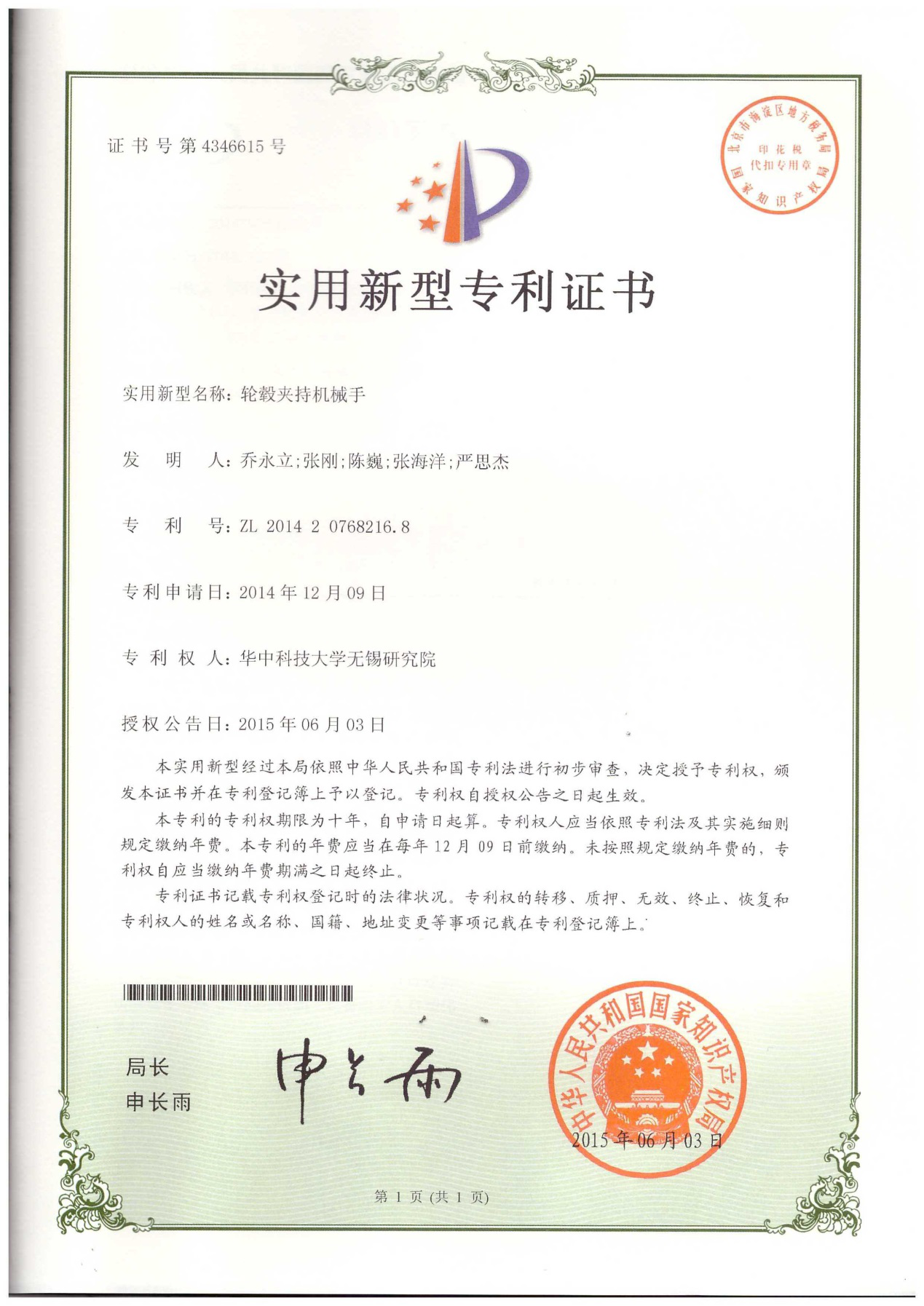 (3) 輪轂五軸搬運機器人及夾持機械手,申請號: 201410745341.1