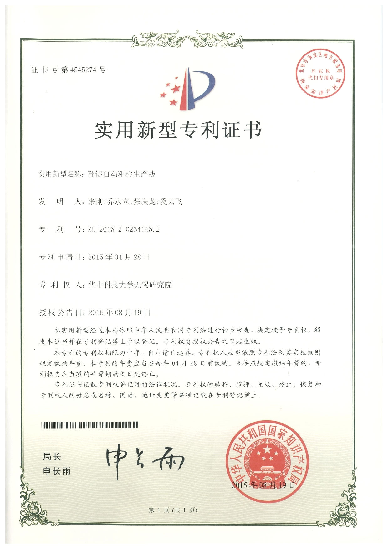 (1) 硅錠自動粗檢生產線,授權號: ZL201510207503.0